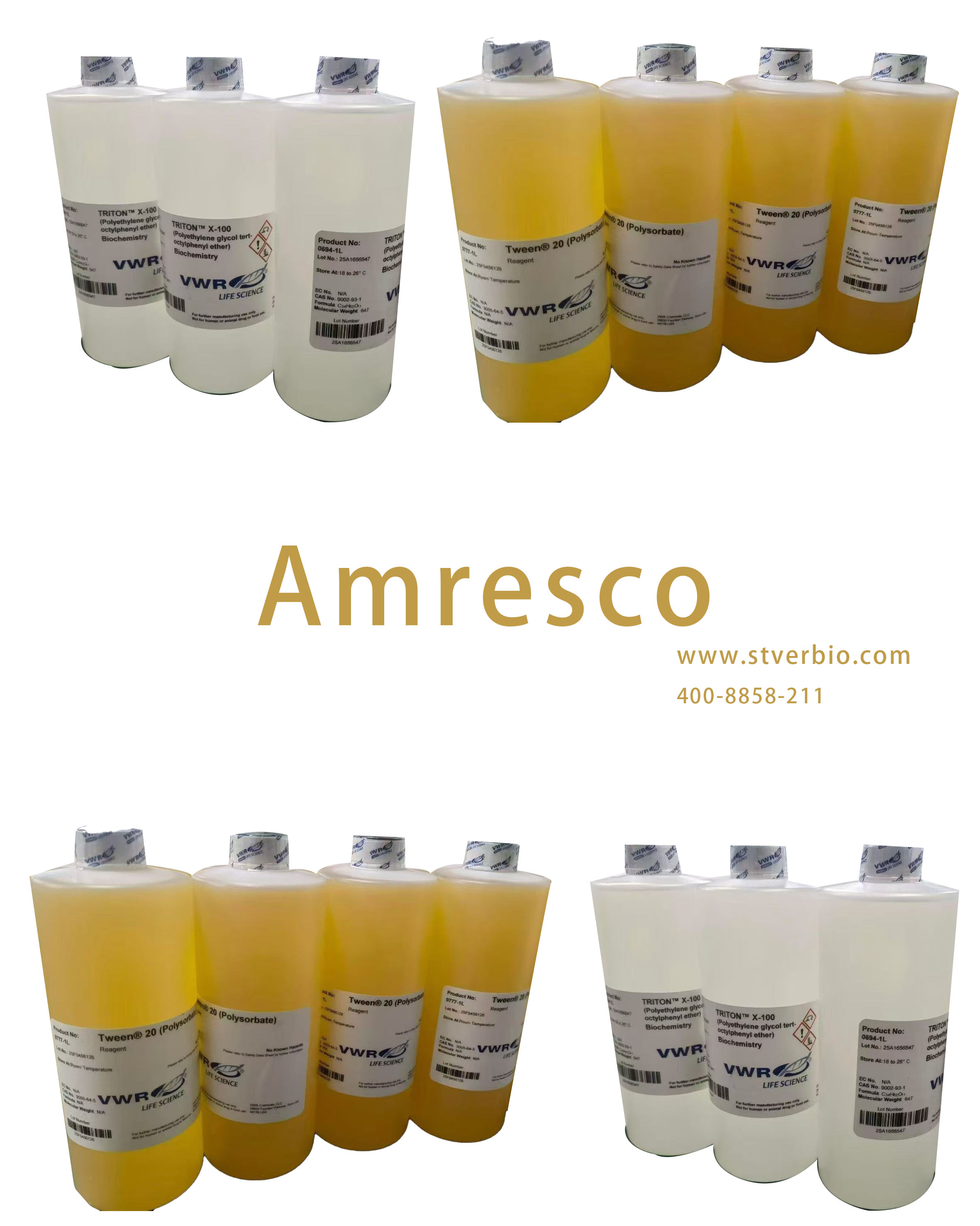 本产品为我公司代理产品,属于Amresco原装产品,渠道可溯源,售后有保障!产品详情见官网:http://www.amresco-inc.com 斯达威尔(北京)生物科技有限公司是一家生产、销售为一体的高科技生物企业。公司拥有专业的研发和质量检测团队,专注于生物产品的不断完善和创新。产品覆盖面广,品质可靠。 公司官网:www.stverbio.com 自营品牌:常规国产试剂:stverbio,进口原料试剂 ;VerSci 【优势品牌】代理.Sigma、Amresco、Anatrace、Glycon(去垢剂)、安徽歌者(血清)、proteintech、TCI、Thermo、Roche、Gibco、Invitrogen、Qiagen、BD、Alfa 、Acros、TRC、Millipore 、Corning、sartorius 、Roche、 Abcam 、Santa、TCI、 CST 、 Axygen 、PAN、ABI、VMRD、Reagecon、 Hyclone 、Eppendorf、MCE、Cytiva、安捷伦、岛津、诺唯赞、艾本德、Biolegend等耗材和试剂等国外知名品牌。